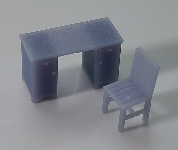 Wykonane w technologii druku 3D biurko i krzesło do modelu mieszkania, nastawni, strażnicy przejazdowej itp. Wymiary biurka – 14,1 x 6,1 mm, wysokość – 8,8 mm