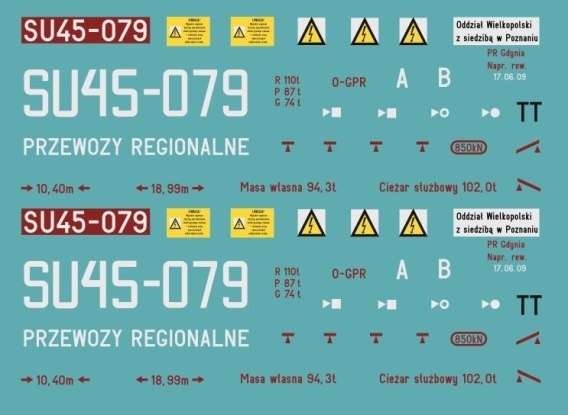Kalkomania na lokomotywę SU45-079 w malowaniu Przewozów Regionalnych