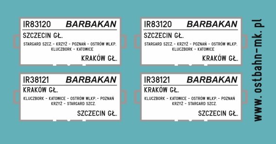 Tablice kierunkowe pociągu "Barbakan" relacji Szczecin – Kraków. Druk z uchwytami. W przypadku nakładania na tablice trawione uchwyty z kalki odcinamy.