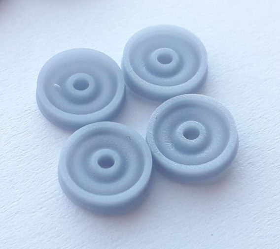 Zestaw drukowanych w żywicy UV kół monoblokowych o średnicy powierzchni tocznej 7,5 mm. Średnica otworu 1,3 mm. Do wykorzystania w modelach lub jako ładunek złomu.