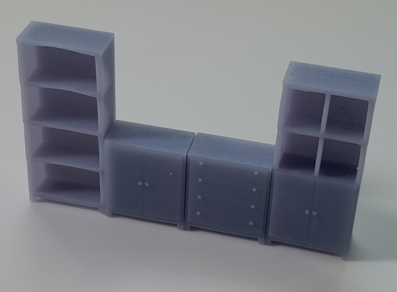 Wykonane w technologii druku 3D meble. Komoda niska z szufladami, komoda niska z szfakami, regał oraz szafa. Głębokość mebli – 4,9 mm, wysokości 20,6 dla mebli wysokich i 10,3 mm dla niskich.