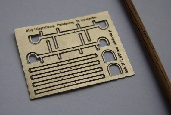 Zestaw do budowy słupa telegraficznego pojedyńczego składający z blaszki 0,2 mm, odlewanych 16 izolatorów oraz słupa drewnianego długości 70 mm.