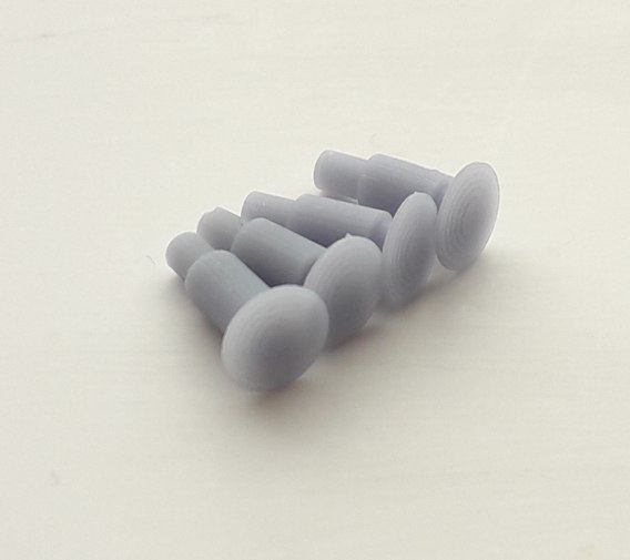 Wykonane w technologii druku 3D zderzaki o średnicy tarczy 4,1 mm. Trzpień mocujący średnicy 1,5 mm